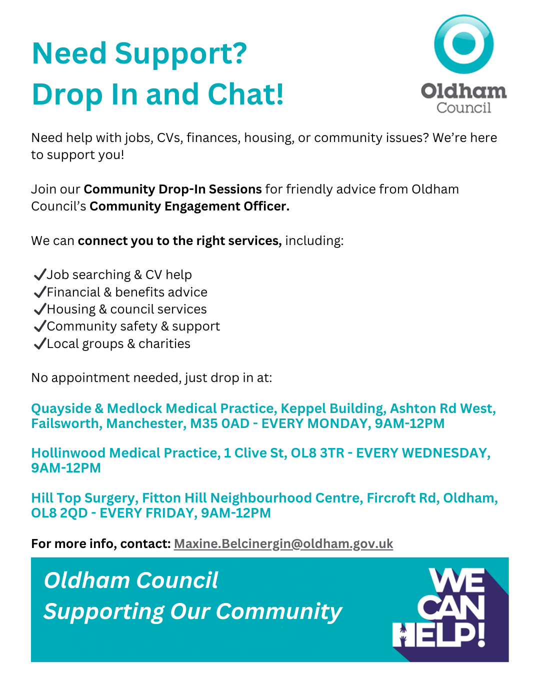 Come to our Community Drop-In Sessions for free advice from Oldham Council’s Community Engagement Officer. No appointment needed, just drop in!