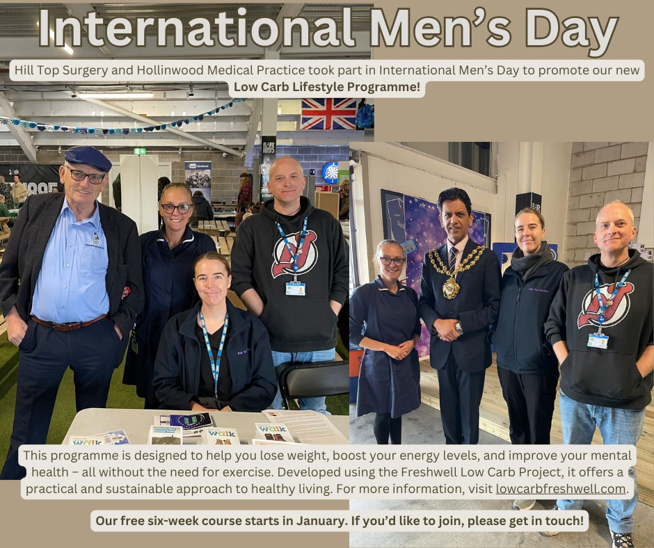 Hill Top Surgery and Hollinwood Medical Practice took part in International Men’s Day to promote our new Low Carb Lifestyle Programme!